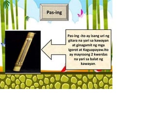 Ang banda ay isang mahalagang bahaging kultura ng Pilipino na tumutugtog tuwing may kasayahan at pagtitipon. Ang pag-ila sa tingtugnaw nga kahoy magkinahanglan og pipila nga pagpahinungod sa paggamit sa gikinahanglan nga praktis aron mapalambo ang kahanas sa pag-ila sa mga kahoy nga walay. Ruler gamit sa pagsukat ng gagawing maliliit naproyekto na may 12 pulgada o 30 sentimetro ang laki.