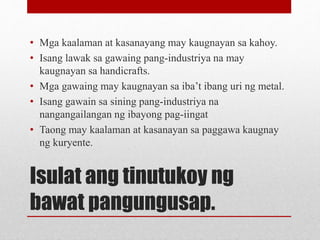 Bukod sa itinuturo ng kanyang guro sa mga gawain sa sining pang -industriya pilit pa niyang inaalam ang iba pang. 1Ano ano ang mga gawaing-sining ang iyong itinanghal. Ang edukasyong Pangkabuhayan ay binubuo ng maraming gwain na may ibat ibang lawak lawak na batay sa mga materyales na sagana sa isang lugar.