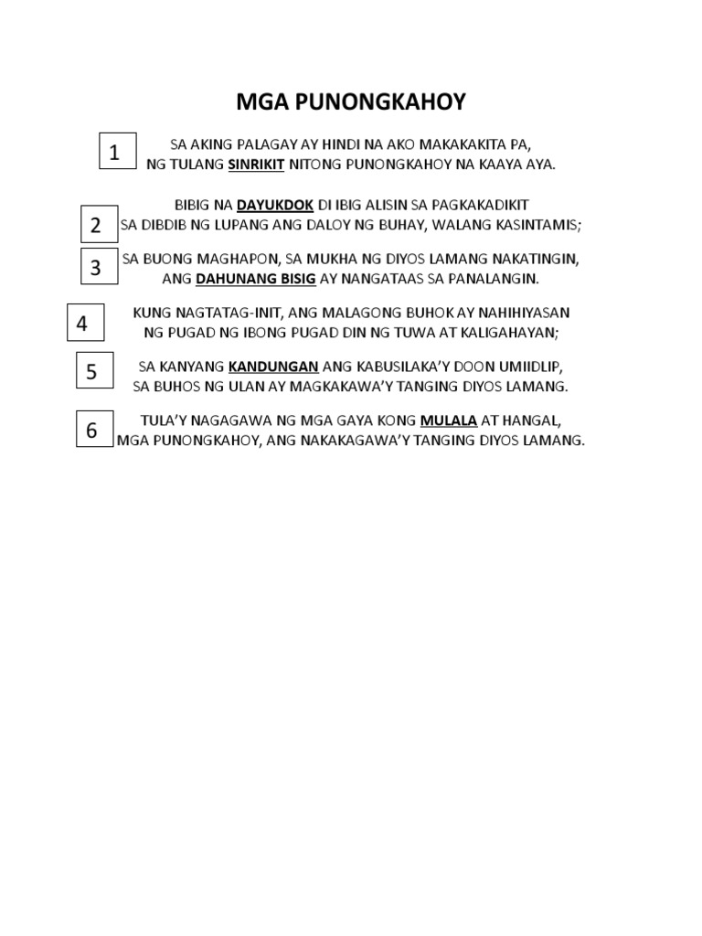 Pag-uugnay sa Sariling Buhay at Talasalitaan batingaw umaalingasaw malamlam laing lambong kampana tumutunog kawalang-buhay tuyo at lanta takip at talukbong Isang Punongkahoy Pag-uugnay sa Sariling Buhay Talasalitaan hiyaw sulyapan orasyon daloy tumatangis pighati malalabay. Baritone n bastos mahalay hindî karapatdapat. Ang pinakasikat na listahan ng mga query.