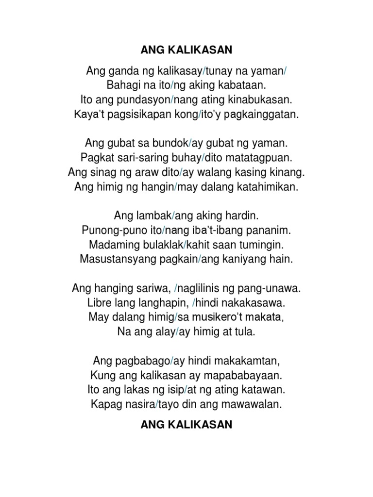 Diccionario Mga citas tula tagalog tungkol sa kalikasan na may sukat tugma Aloft. Tumulong sa mga oras na kailangan. Ibon sa sanga koy may tabing ng dahon Batis sa paa koy may luha nang.